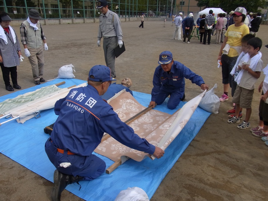 札幌にも活断層があるそうで、もしもの大震災の時はあっちもこっちも崩れたりしてとてもじゃないが救助隊の方々も全てに手が回りません。人任せで助けが来るまで待ってるわけにもいきません。やっぱり自分たちの身は自分たちで守らなくちゃね、というわけで防災訓練なわけです。消防署の方々を中心に、いざというときのための訓練をおこないました。毛布を使った簡易担架でけが人を運んだり、消火器を噴射して的を倒したり、煙で充満したテントをくぐり抜けたり、応急処置の仕方を習ったりしました。
