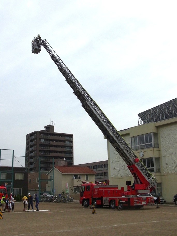 小学生以下の子供たちは、はしご車に乗せてもらって楽しそう。いいなぁ、ちびっ子は。